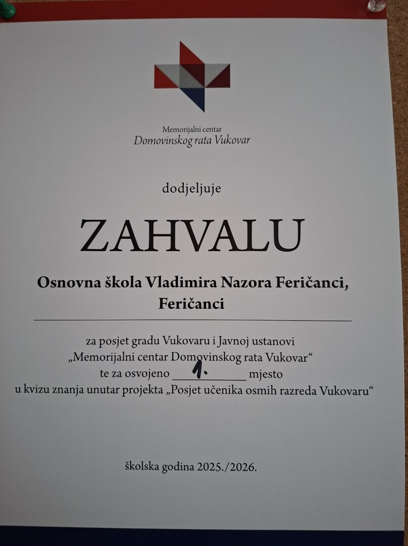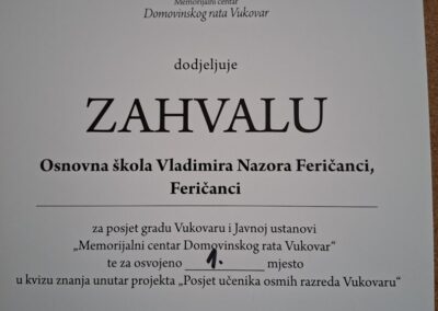 Također, učenici su sudjelovali u edukativnom predavanju „Škola mira“ i kvizu znanja u kojem su naši učenici Vito Ivanović i Jakov Šalek pokazali izvrsno znanje o Domovinskom ratu te osvojili prvo mjesto u konkurenciji škola iz Našica i Đurđenovca.