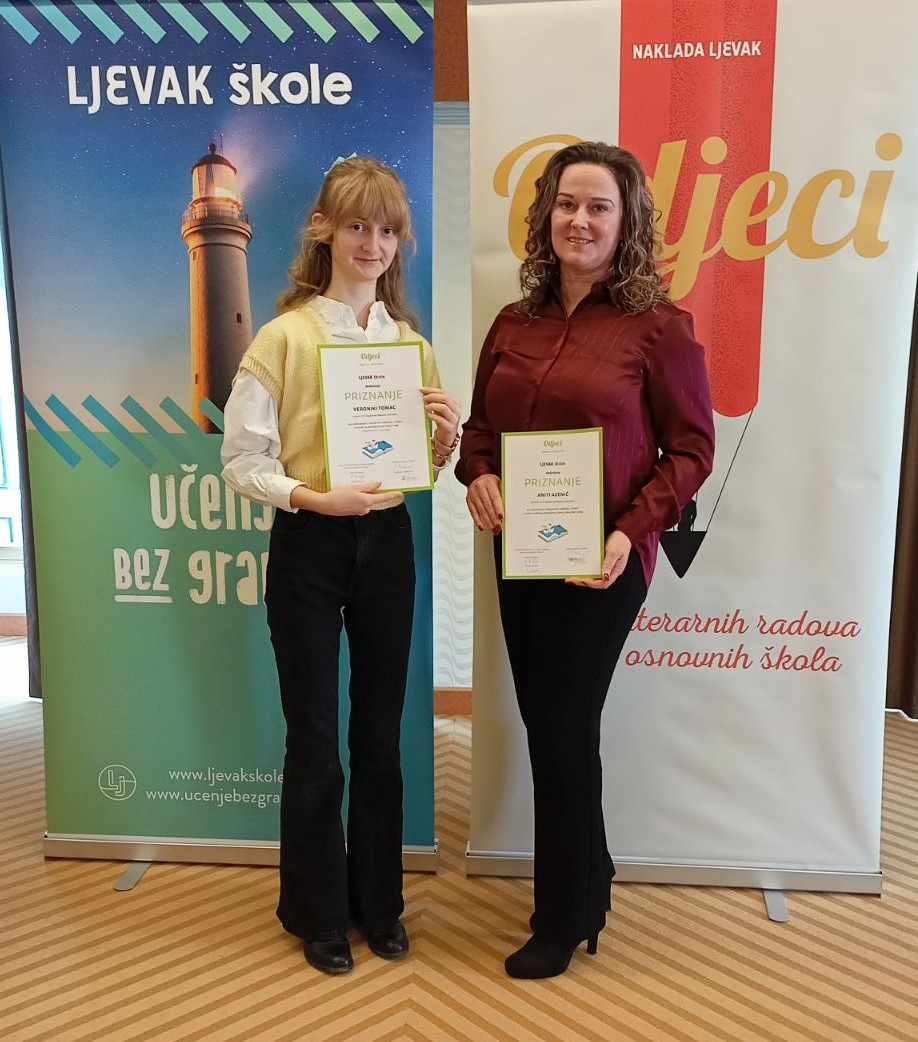 Iako je Veronika sada već srednjoškolka, još je jednom našu školu učinila ponosnom i to pjesmom Posljednji lik moje bake s kojom je krajem prošle školske godine sudjelovala na 20. literarnom natječaju Odjeci Naklade Ljevak. Na ovaj su natječaj pristigli radovi iz cijele države, a upravo je njezin literarni rad, drugu godinu zaredom, odabran za najbolji rad u Osječko-baranjskoj županiji.